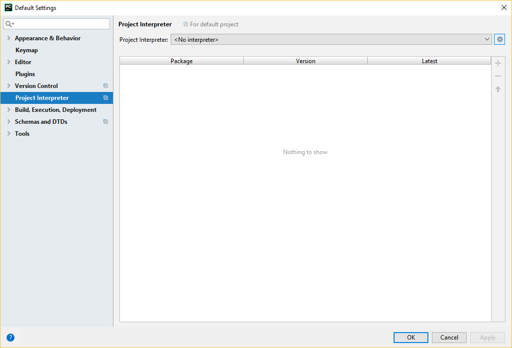 In the settings page select "Project Intepreter"--this is where you can add additional interpreters for use across projects. You might have something different shown here for an already existing interpreter.