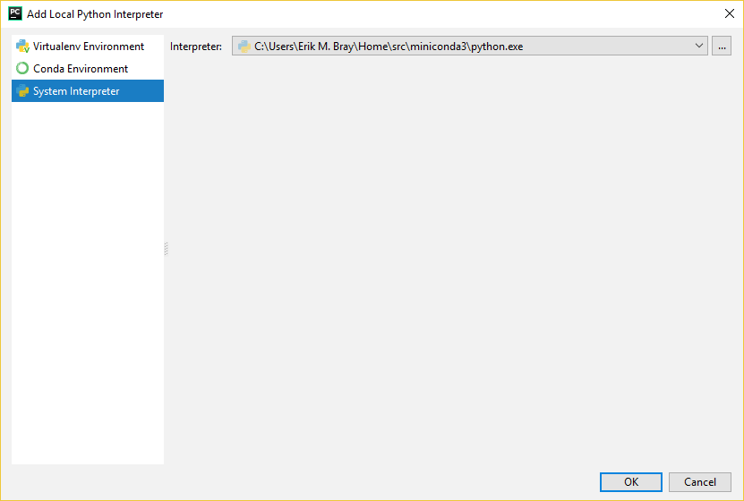 Click the little gear icon in the top-right corner next to the drop-down list of available interpreters, and select "Add Local" from the menu. Then from the list of interpreter types, select "System Interpreter":