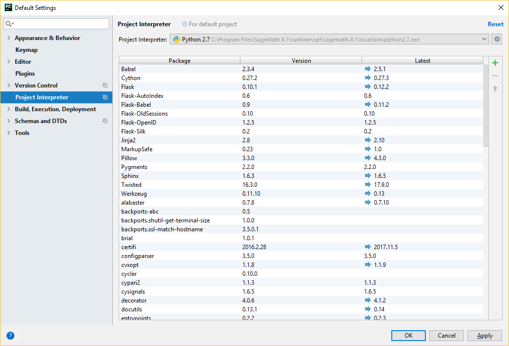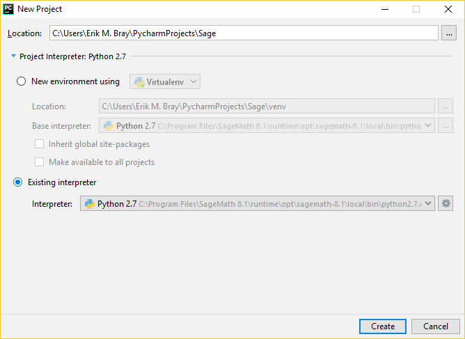 Then when you start a new project, make sure to select the Sage Python as the default interpreter (you might be able to use it with a virtualenv as well but I haven't tried that--if you do make sure it inherits system site-packages, or else you don't get Sage, etc.) In general I don't think it's necessary: